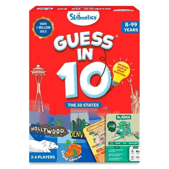 Get ready to play the most exciting game of questions! Ask up to 10 questions to guess the animal, state, dinosaur, or Marvel character on the Game Card! Think hard, ask intelligent questions, use your clue cards wisely, and the be the first player to win 7 Game Cards!