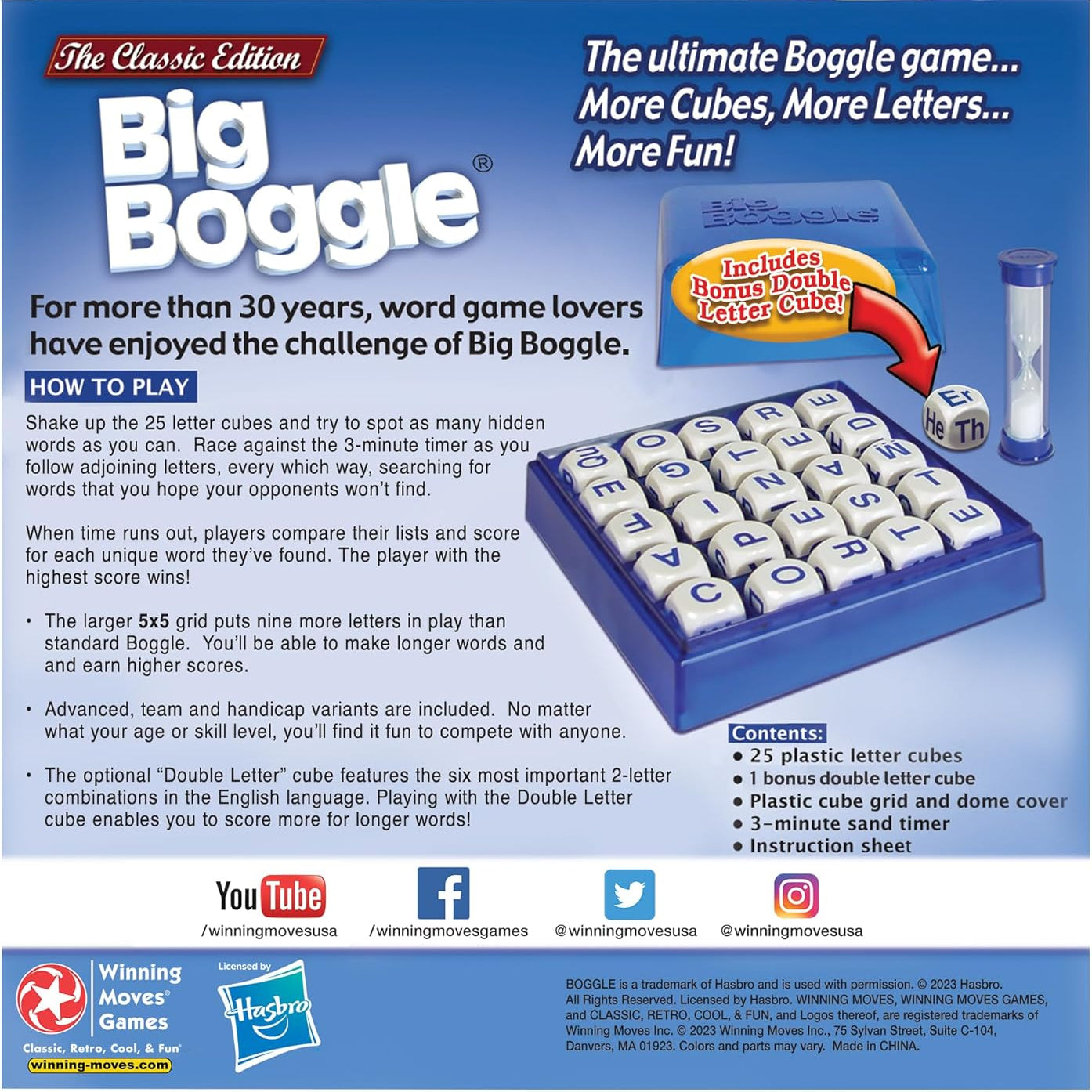 Shake up the 25 letter cubes and try to spot as many words as you can. Race against the 3-minute timer as you follow adjoining letters, every which way, searching for words that you hope your opponents won't find. When time runs out, players compare their lists and score for each unique word they have found. The player with the highest score wins! This game contains a bigger grid, more cubes and allows for higher scores. Bonus: The New "Double Letter" Cube Makes It Easier To Form Longer Words.
