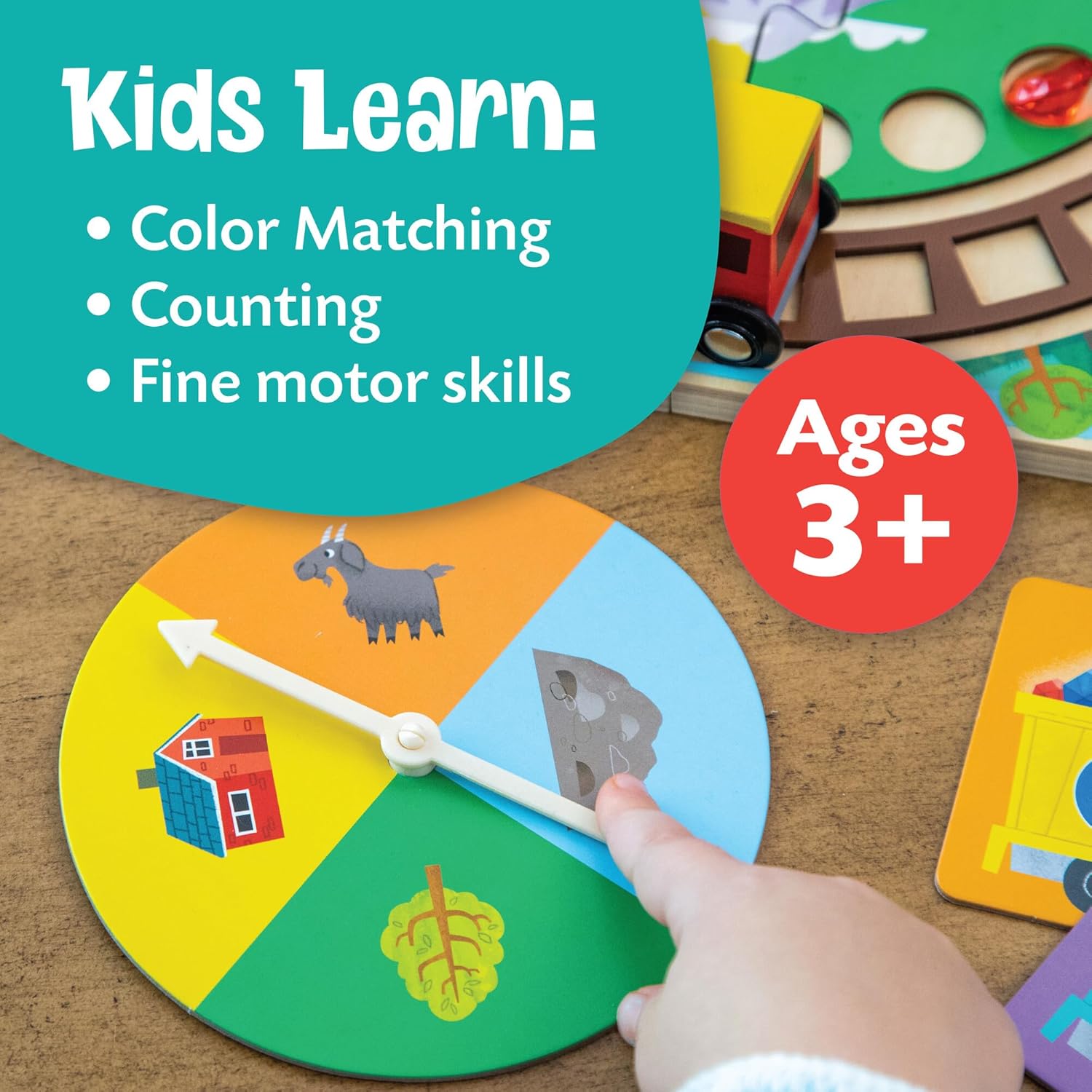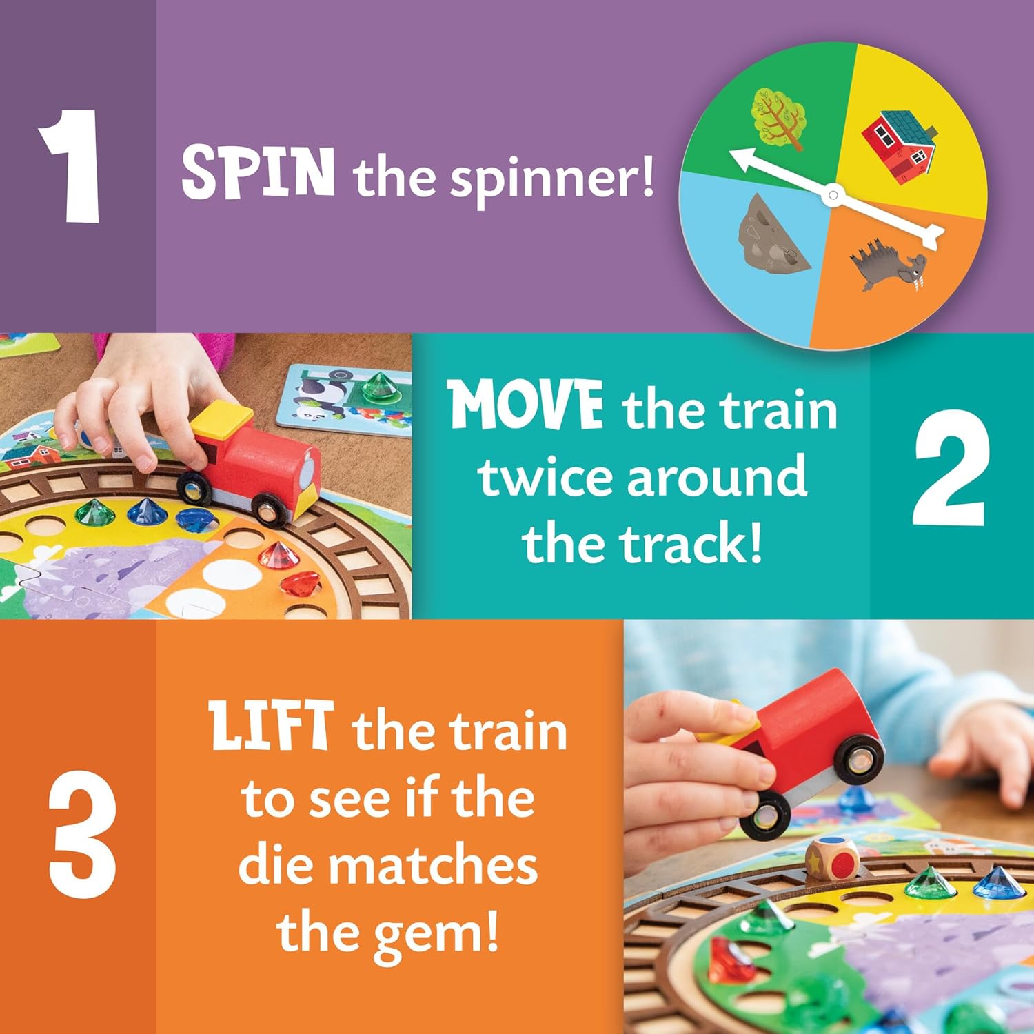 All aboard for a fun, cooperative adventure with Peaceable Kingdom Round the Mountain! Players work together as conductors, rolling the train around the mountain track to collect shiny gems and fill their mining carts. But watch out—each turn brings the chance of falling rocks! As the wooden train moves around the track, the die rolls underneath, creating a satisfying click as it travels. Lift the train to reveal the color you rolled, match it to a mining cart and collect gems before four falling rocks appear. Fill all the carts with three gems each to win together! With no reading required and beautifully crafted wooden pieces, this cooperative board game is perfect for ages 3 and up. Round the Mountain encourages teamwork, color recognition and fine motor skills while delivering a playful, screen-free experience the whole family can enjoy.
