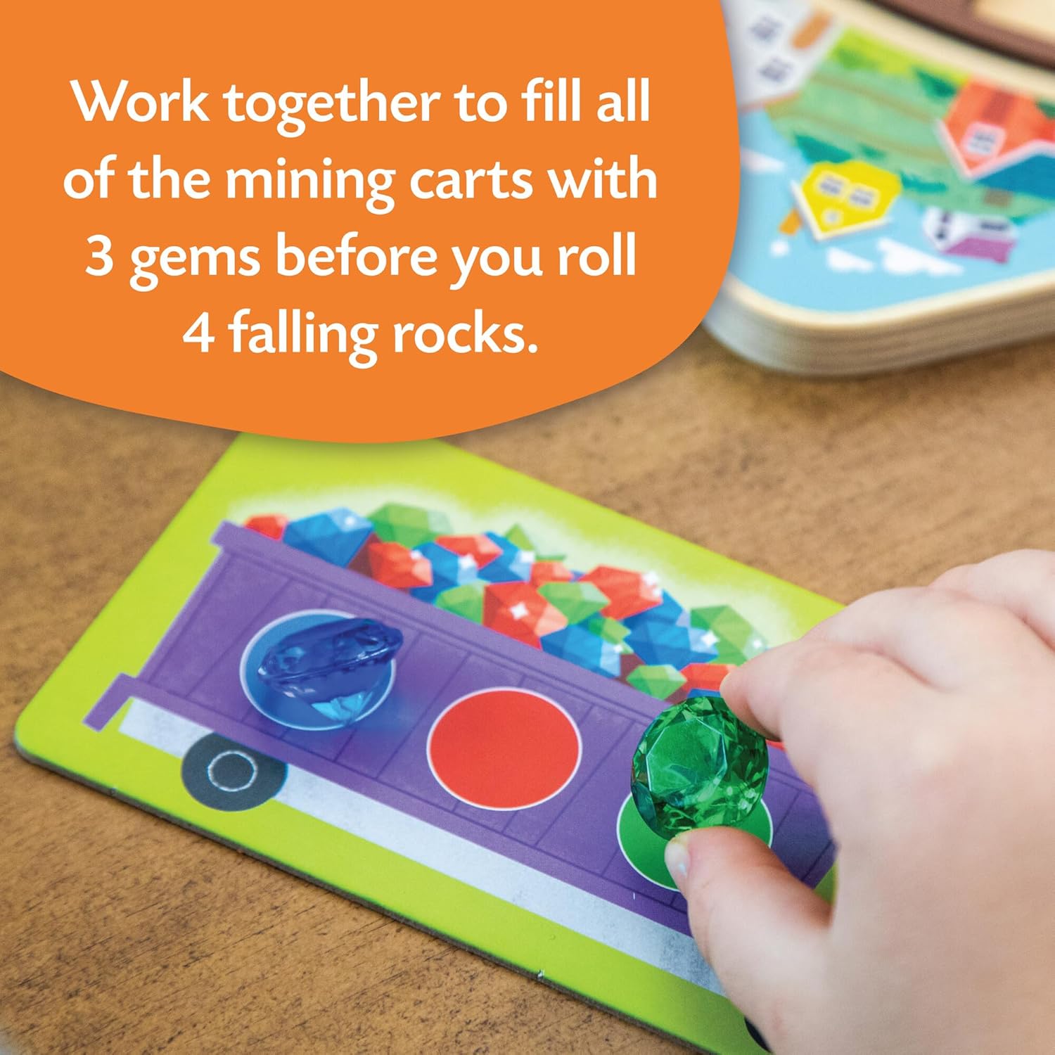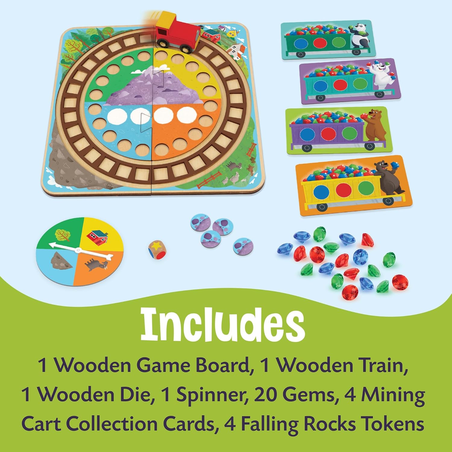 Includes wooden game board, wooden train, wooden die, spinner, 20 gems, 4 mining cart collection cards, 4 falling rock tokens and instructions