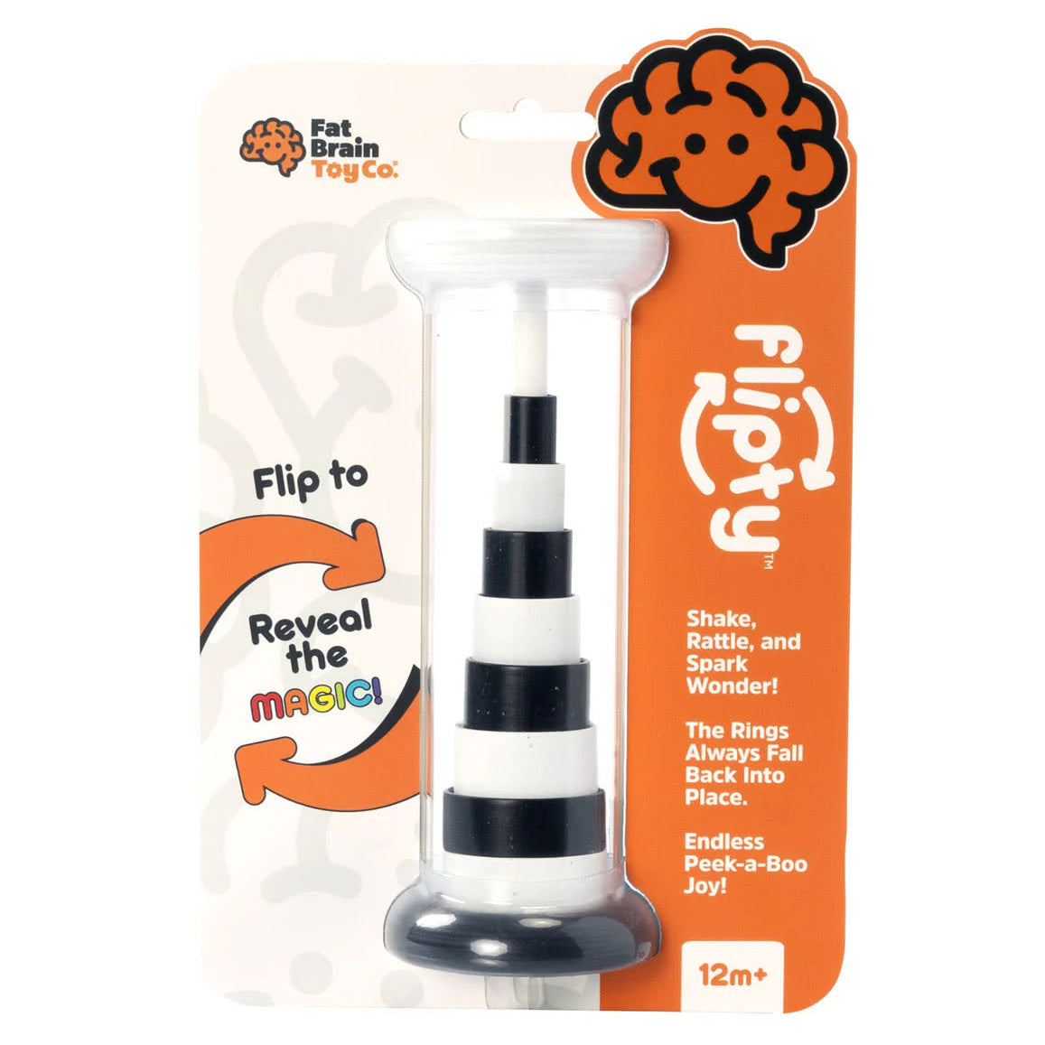 Grasp, rattle, and flip to see the Flipty Toy transform from the black-and-white stack into a beautiful array of rainbow colors! Spark imaginations with this fun sensory toy from Fat Brain Toys that helps develop fine motor skills and cause-and-effect learning.