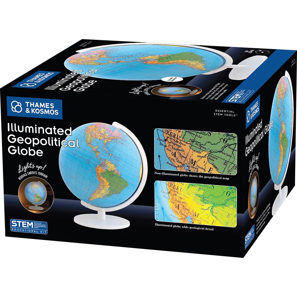 Explore the world from its great cities and vast countries to its majestic mountains and mighty rivers. This ten-inch-diameter plastic globe has a light inside, allowing it to function in two modes. In its non-illuminated mode, the globe displays a detailed, exquisitely designed physical and political map of Earth. At a glance, you can see country borders, cities, rivers, and more. Switch on the built-in light to reveal Earth’s geological features, like mountains and deserts. The globe comes in two easy-to-assemble hemispheres and is powered by a USB-C cord, which includes an on-off switch.