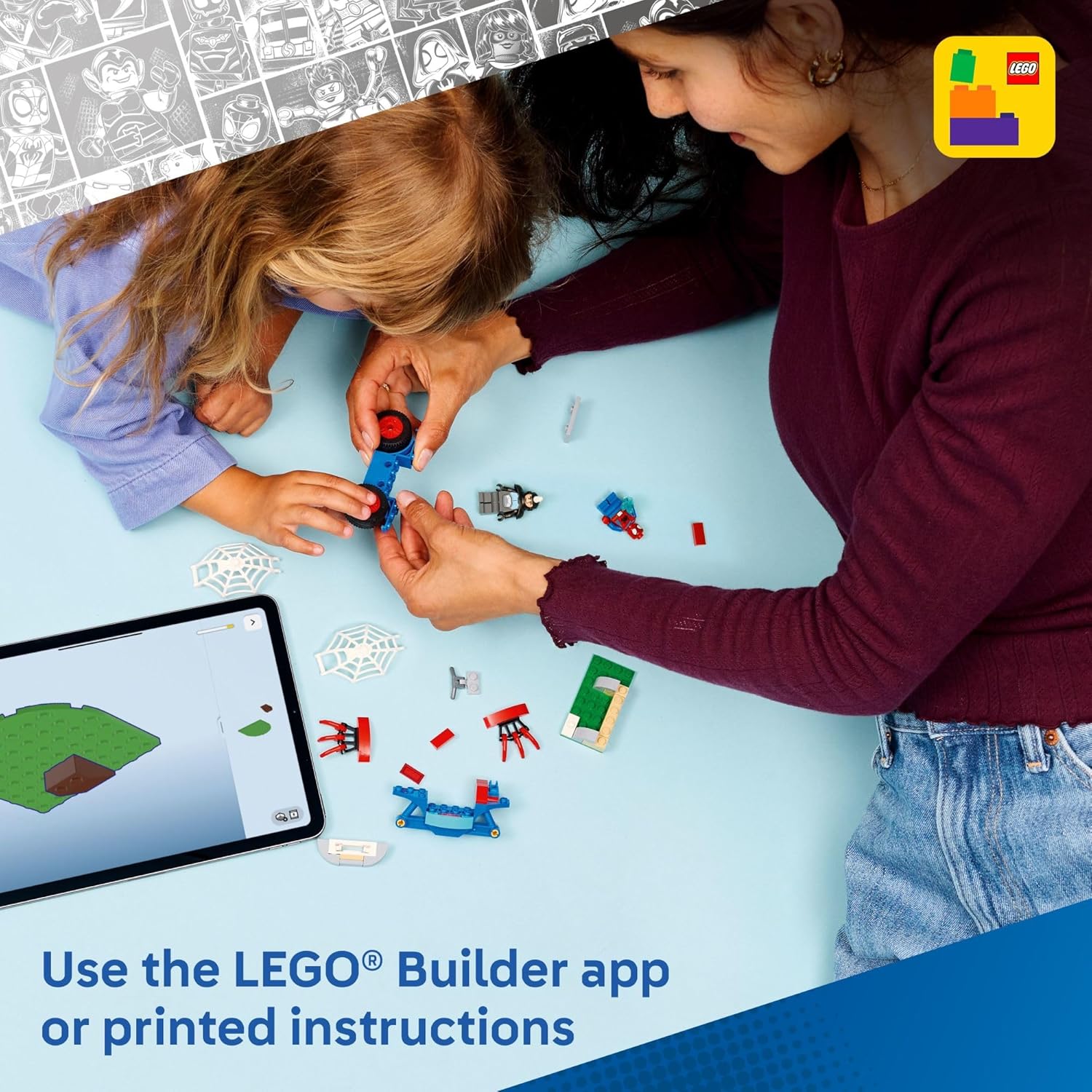 Put Super Hero action into kids’ hands with this Spidey on his Motorcycle vs. Rhino (11206) building toy for boys and girls ages 4 years old and up. With Spidey and Rhino minifigures and a spider-shaped motorcycle, this Spidey building set is a great way to help kids develop their creative skills. Kids help Spidey retrieve a stolen blue gem, dodge flying pizzas launched from Rhino’s pizza oven shooter, and capture Rhino in a giant spiderweb trap – which also fits onto the motorcycle. Designed with budding builders in mind, this building set is packed with details to inspire kids with endless imaginative play. It makes a great birthday or any-time gift for fans of Spidey And His Amazing Friends. It comes with colorful pictorial instructions, large Starter Bricks and separate bags containing 1 buildable model per bag to make construction fast and fun. With the LEGO Builder app, kids can zoom, rotate in 3D and track progress with easy-to-follow digital instructions.