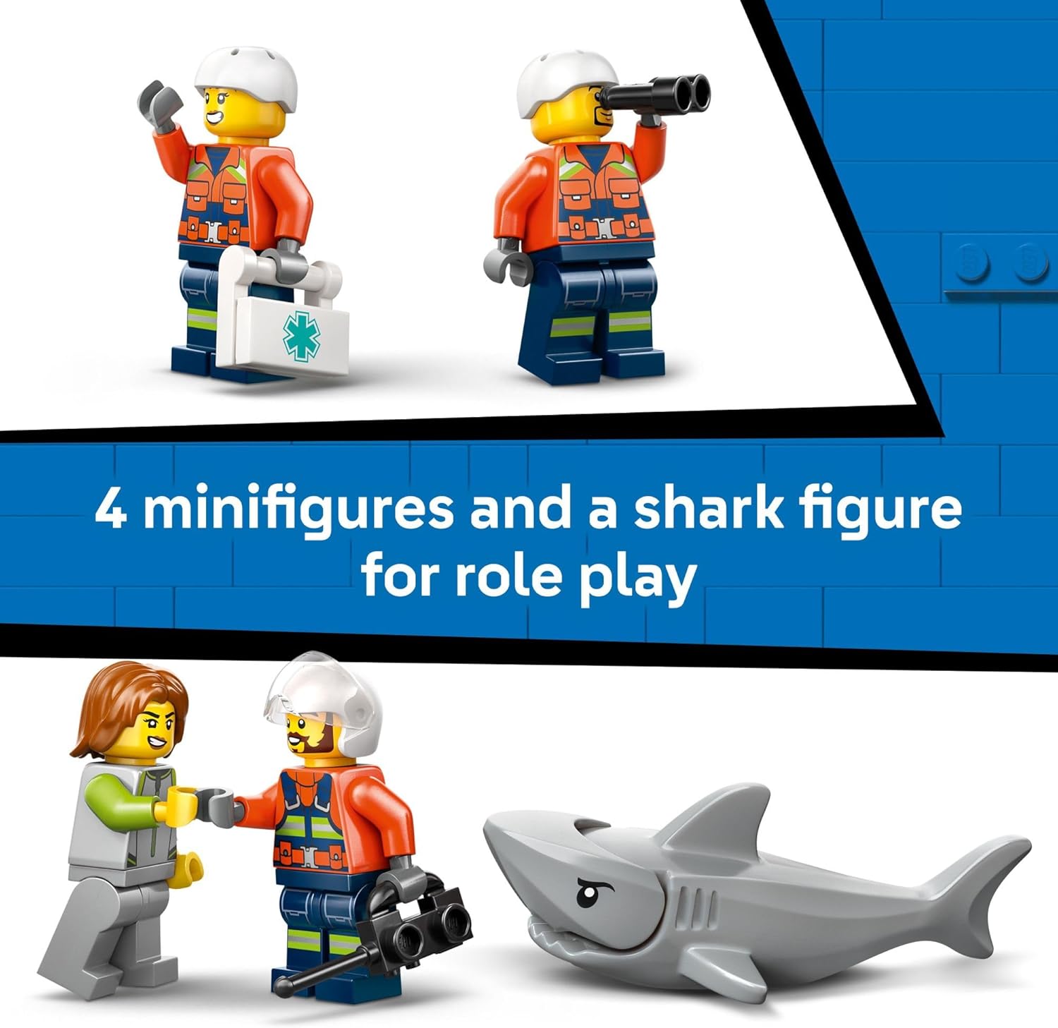 Exciting search and rescue adventures await with the LEGO City Coast Guard Helicopter (60503) building toy for kids ages 7 years old and up. This impressive toy helicopter is packed with authentic details, including spinnable rotors, sliding side doors, a fold-down rear ramp and a detailed cockpit and fuselage. Kids can lower a crew member with the helicopter winch, and the set includes a rescue capsule that folds open for access to its interior. Builders can dream up thrilling rescue missions with the included pilot, civilian, and 2 coast guard minifigures and shark figure. This pretend play toy for kids can be combined with other sets in the LEGO City range (each sold separately) for even bigger adventures. Makes a great birthday gift or anytime treat for boys and girls who love helicopter toys and building challenges. For more fun, parents can help kids access intuitive building instructions and 3D building tools in the LEGO Builder app.