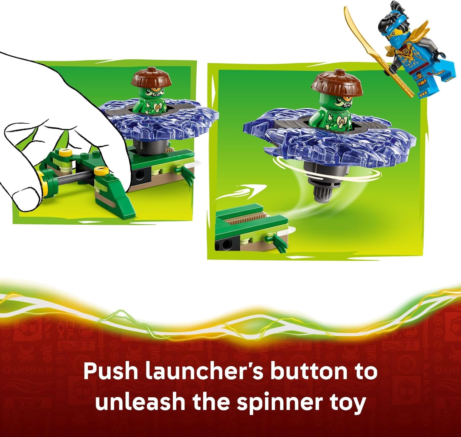 Aspiring ninjas spin into action with the LEGO NINJAGO Nya vs. Mutation Monster Spinner (71849) building toy for boys and girls ages 6 years old and up. Builders are placed in the center of the action as they build their playset and practice Spinjitzu techniques or recreate scenes from season 4 of the NINJAGO Dragons Rising TV show. Once their build is complete, kids push the launcher's button to send the spinner toy into a quick spin and watch the 2 elemental power parts fly off when it hits its target. This set includes 2 minifigures: Nya with a glaive weapon accessory and the villainous Mutation Monster, who can ride inside the spinner, inspiring hours of pretend play good vs. evil battles. Makes a fun birthday gift or anytime present for kids who love ninja action and adventure toys. The LEGO Builder app provides easy-to-follow instructions where kids can save sets, track progress, and zoom in to rotate models in 3D while building.