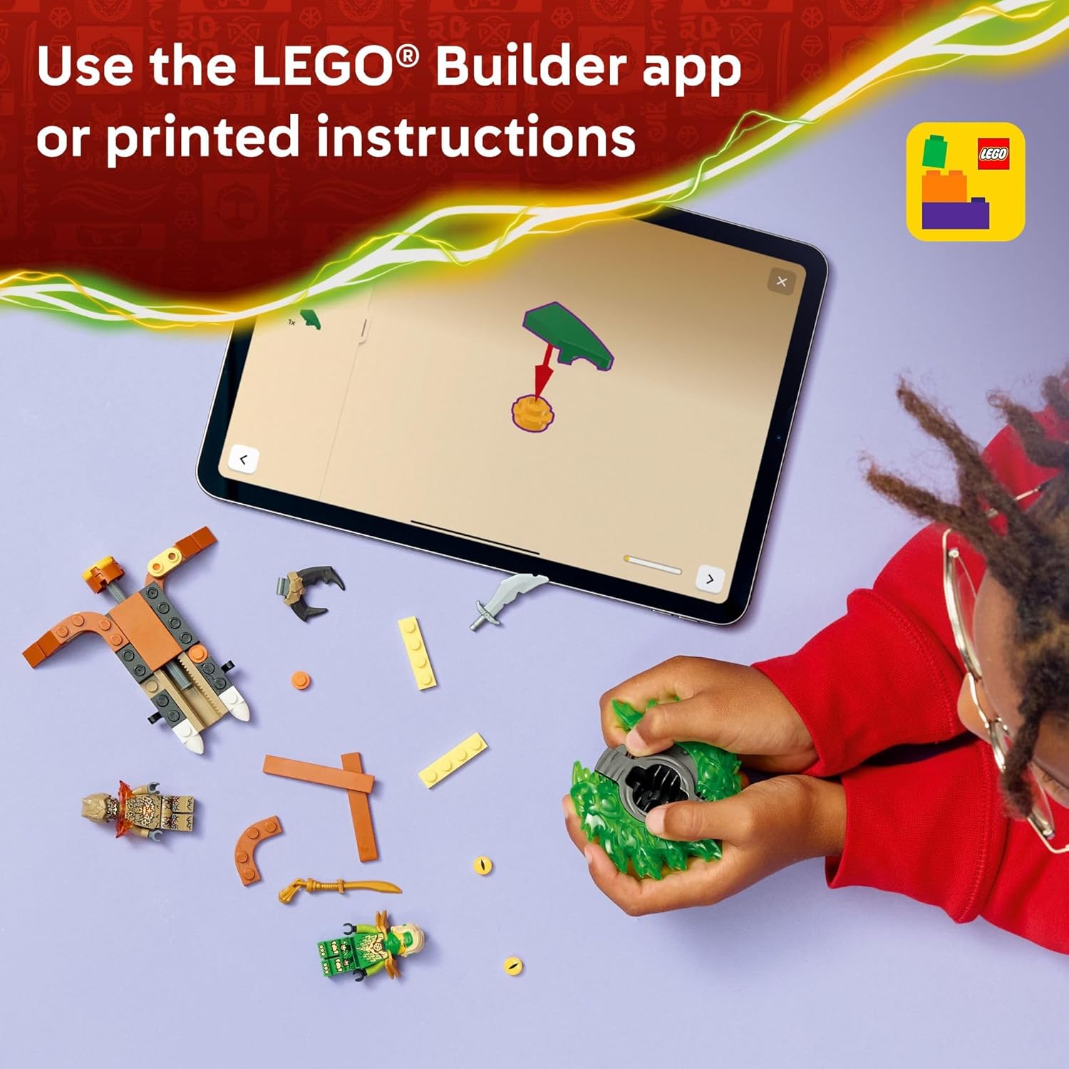 Kids launch into action with the LEGO NINJAGO Lloyd vs. Earth Monster Spinner (71850) building toy for boys and girls ages 6 years old and up. This ninja toy playset for kids puts them at the heart of the action, imagining good vs. evil battles, practicing Spinjitzu techniques, and recreating scenes from season 4 of the NINJAGO Dragons Rising TV show. Once their build is complete, kids can push the launcher's button to send the spinner toy into a quick spin and watch the 2 elemental power parts fly off when it hits its target. This set includes 2 minifigures: Lloyd with a sword weapon accessory and the villainous Earth Monster, who can ride inside the spinner, inspiring hours of pretend play good vs. evil battles. Makes a fun birthday gift or anytime present for kids who love ninja action and adventure toys. The LEGO Builder app guides kids on an intuitive building adventure where they can save sets, track progress and zoom in and rotate models using 3D instructions.