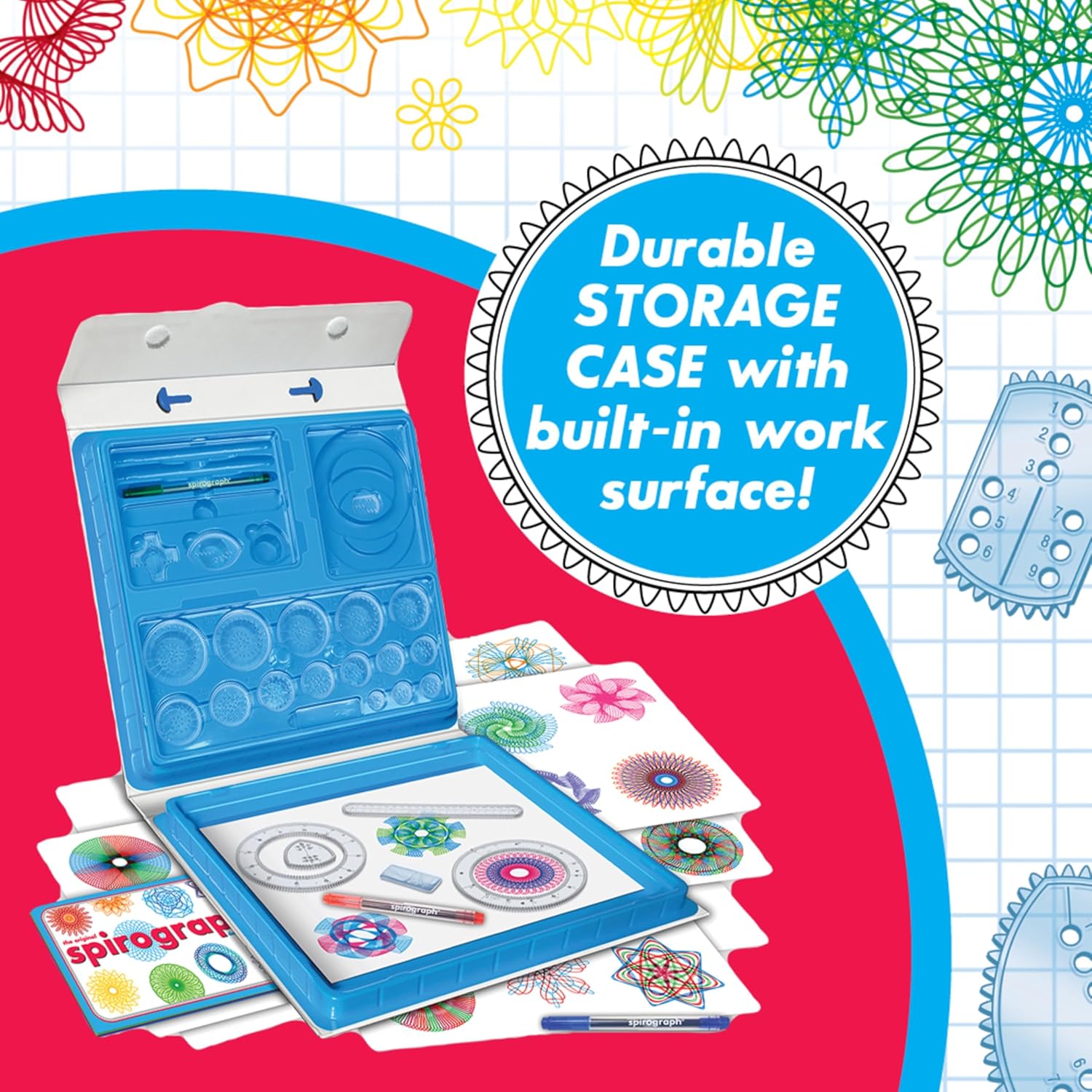 This set features all the iconic wheels and rings of the original, re-engineered and updated for today. Simply choose from the gears and wheels, put your paper in place, and create whirling, spiraling, mix and match patterns for a totally awesome image. Use the design guide to try out tried and true designs, or get creative and create cool and colorful graphics of your own. The 45-piece Deluxe Set includes 19 Spirograph Precision Wheels, 2 Spirograph Precision Rings, 1 Spirograph Precision Rack, 0.21 ounces of Reusable Spiro-putty, 3 Retractable Ballpoint Pens, 14-page Guide Book and 20 sheets of design paper. It all comes in a carry-along storage case with a built-in work surface.