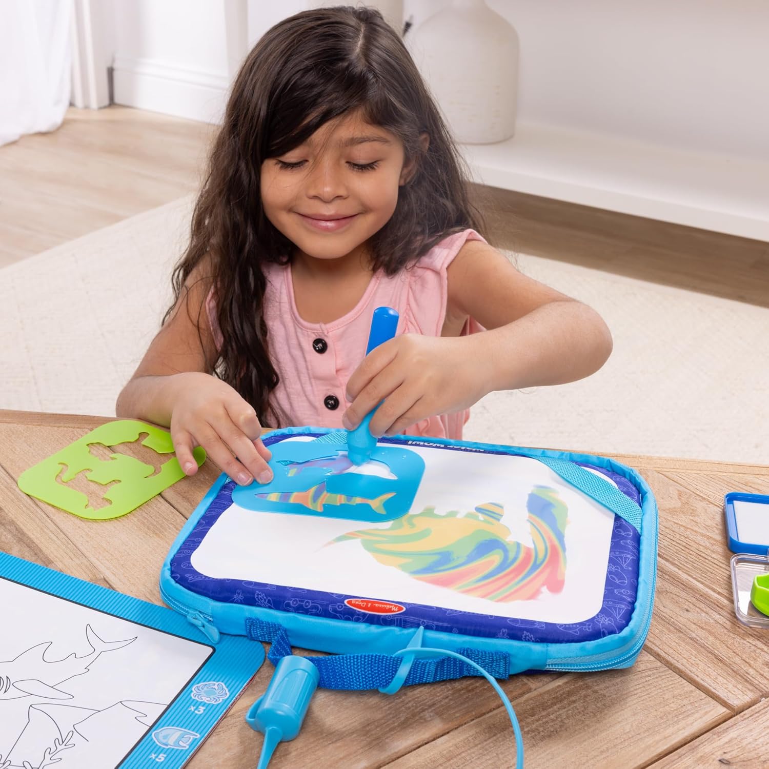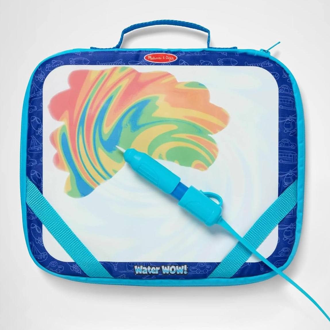 Includes a zip-up case with storage pockets, reusable rainbow board, 4 Water WOW! cards, 2 stencils, 2 water stamps, sponge stamp pad, large refillable water pen, and tethered cap.