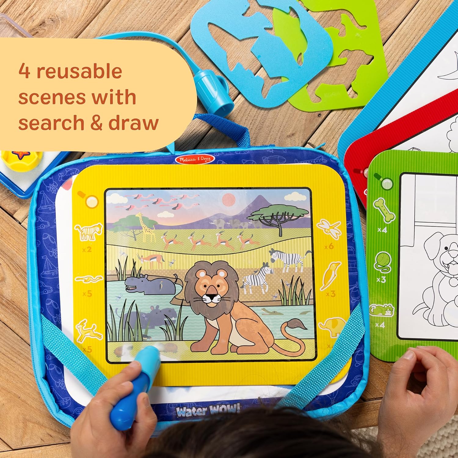 Discover new ways to color with water, then let dry and color again and again! The take-along zip-open case has a built-in drawing board with water-reveal rainbow swirls for free drawing, and pockets to hold reusable double-sided activity cards, two stencils for tracing, two stamps, a sponge stamp pad, and a large water pen that can tether to the case so it doesn’t go missing! The four activity cards each include a water-reveal scene (farm, safari, pets, ocean), search-and-find activities, and how-to-draw illustrations. Everything stores in the case, making the Melissa & Doug Water WOW! Multi-Activity Drawing Set the perfect mess-free, reusable travel activity for families on the go!